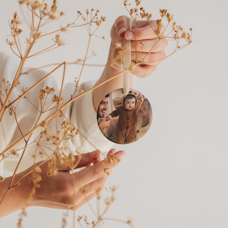 Le decorazioni natalizie personalizzate vengono fatte a mano e mostrano una fantastica stampa di alta qualità su tutta la superficie. Questi addobbi natalizi con foto sono dei dischi in ceramica, piuttosto spessi e leggermente un po' più pesanti delle palline natalizie personalizzate. Utilizziamo una tecnica di stampa digitale 3D, un processo di sublimazione termica che imprime gli inchiostri sulla superficie in maniera permanente e indelebile, assicurando che i colori restino brillanti anche col passare del tempo.