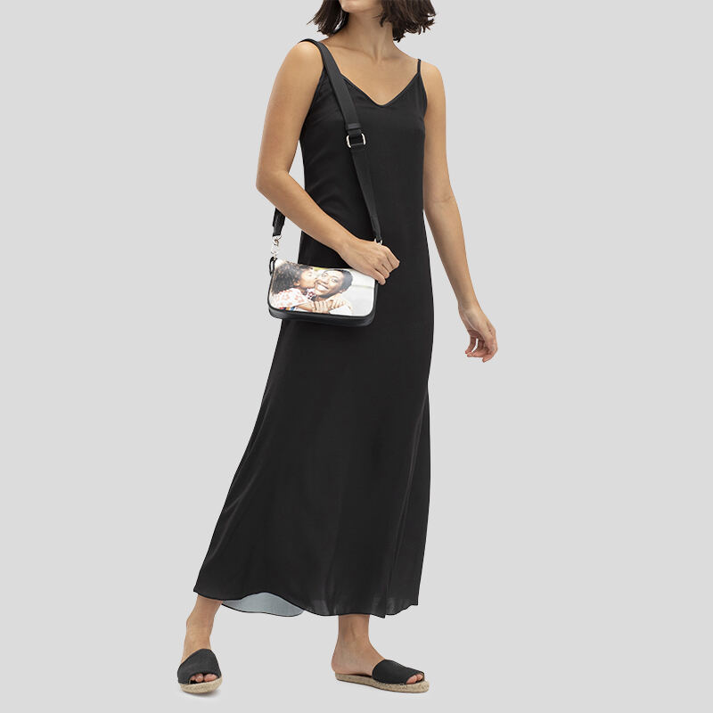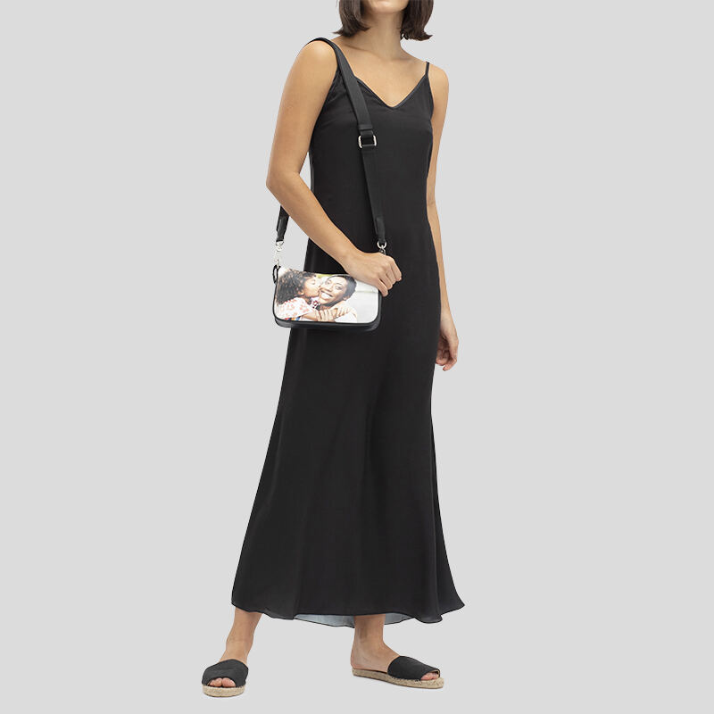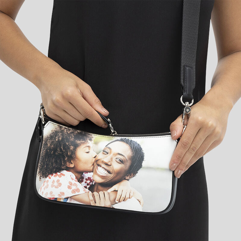 Grazie alla nostra esperienza, stampiamo le tue foto direttamente sulla pelle per fondere l'inchiostro al materiale. I colori appaiono audaci, luminosi e pieni di vita e non sbiadiscono nel tempo. La pelle viene tagliata su misura e cucita insieme e viene aggiunto il tessuto scamosciato di colore nero per creare la fodera. Aggiungiamo i dettagli per creare una magnifica borsa baguette personalizzata completamente funzionale.