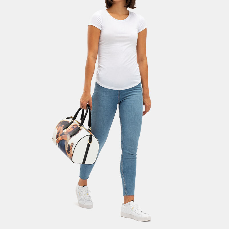 A differenza delle migliaia di borse sul mercato fatte a macchina, i nostri borsoni a bauletto con foto vengono fatti su ordinazione presso il nostro studio. Ciò è garanzia di qualità e accuratezza nella produzione della tua borsa a bauletto personalizzata. Dopo l'elaborazione del tuo ordine, le nostre stampanti, leader nel settore, iniziano a stampare direttamente sulla pelle di Nappa. Il nostro team di esperti, poi tagliano, danno forma e cuciono la pelle, dando vita alla tua borsa. Per garantire la massima attenzione al dettaglio, i bordi dei manici, delle linguette di chiusura, dei tiretti delle zip, della striscia laterale nera e delle finiture in pelle della tracolla vengono tutti dipinti a mano. Questa caratteristica premium garantisce che i bordi siano impermeabili pur rimanendo flessibili. Prima dell'invio, il nostro dipartimento di qualità verifica il prodotto, prima della consegna.
