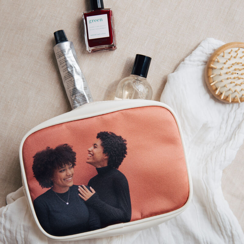 Questa trousse accompagnerà la giornata di una persona davvero speciale, allora scegli un primo piano romantico col proprio partner, una fotografia di gruppo delle tue migliori amiche durante una serata da ricordare, una grafica o le parole di una canzone che fa sognare oppure l'immagine di una famosa icona del cinema a cui ispirarsi durante i ritocchi di make-up.