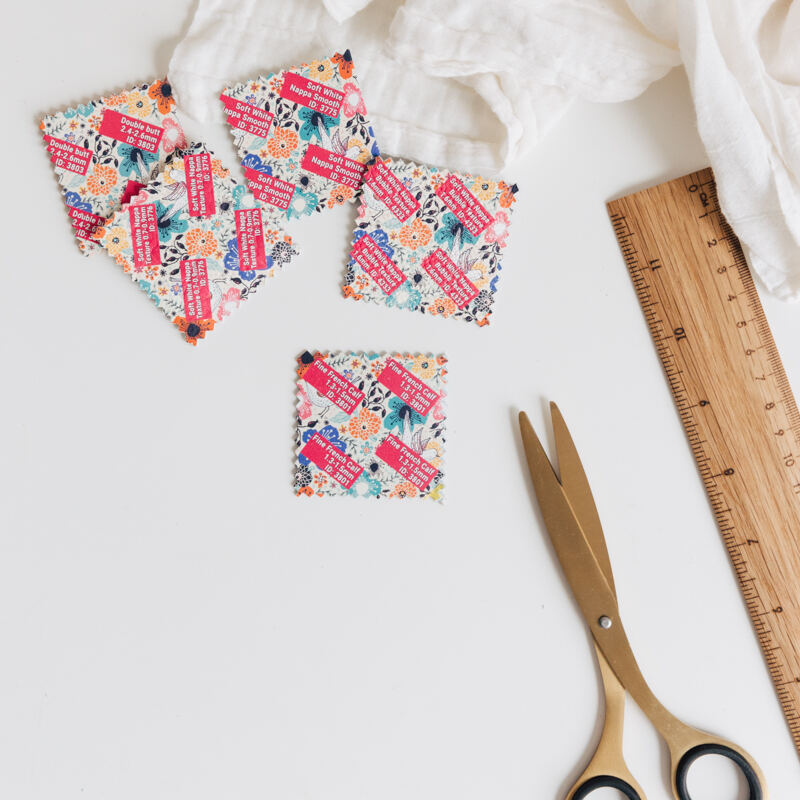 I tessuti stampati e la carta vengono tagliati in quadrati di 7 x 7 cm, con bordi rosati, e riuniti in un comodo pacchetto prima di essere spediti. Le pelli stampate sono tagliate in quadrati di 5,5 x 5,5 cm, sempre con bordi rosa.
