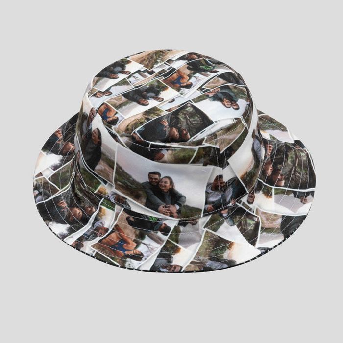 Per un cappello pescatore su misura dal carattere unico, crea collage fotografici, pattern geometrici o frasi motivazionali. Se preferisci un cappello bucket personalizzato minimal, prediligi tinte neutre e dettagli tono su tono.