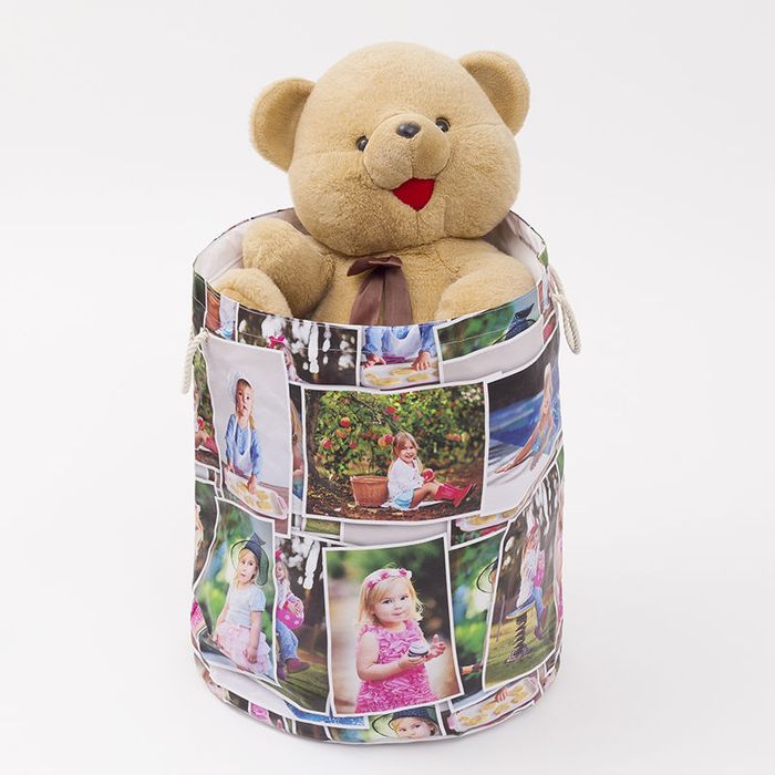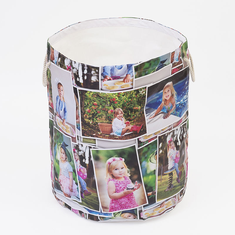 Crea un sorprendente collage con le tue foto, i personaggi dei cartoni animati o i supereroi preferiti di tuo figlio. Basta caricare una raccolta di foto, selezionare tutto e quindi scegliere tra i diversi stili di montaggio predefiniti. La cesta portagiochi personalizzata è un accessorio divertente per camere da letto, asili e sale giochi.