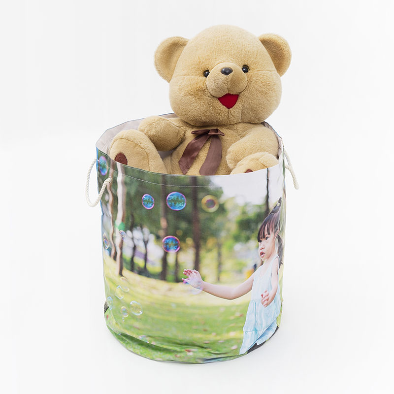 La tua cesta portagiochi personalizzata viene realizzata su ordinazione, rifinita e cucita completamente a mano dai nostri esperti tecnici. Stampiamo le tue foto su due pezzi di tessuto, che cuciti su una fodera impermeabile, formano la parte frontale e posteriore del porta giochi con foto. Le maniglie in corda sono inserite in entrambi i lati per una finitura impeccabile. Il sistema di stampa utilizzato è tecnologicamente avanzato e il completo assorbimento del colore nelle fibre del tessuto permette di avere colori perfetti negli anni.