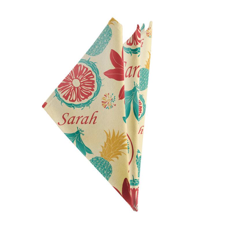 Il tuo disegno viene stampato sul tessuto usando metodi di infusione profonda che permette di creare una stampa di lunga durata lavaggio dopo lavaggio. Il tuo fazzoletto in stoffa viene quindi tagliato su misura e rifinito da mani esperte.