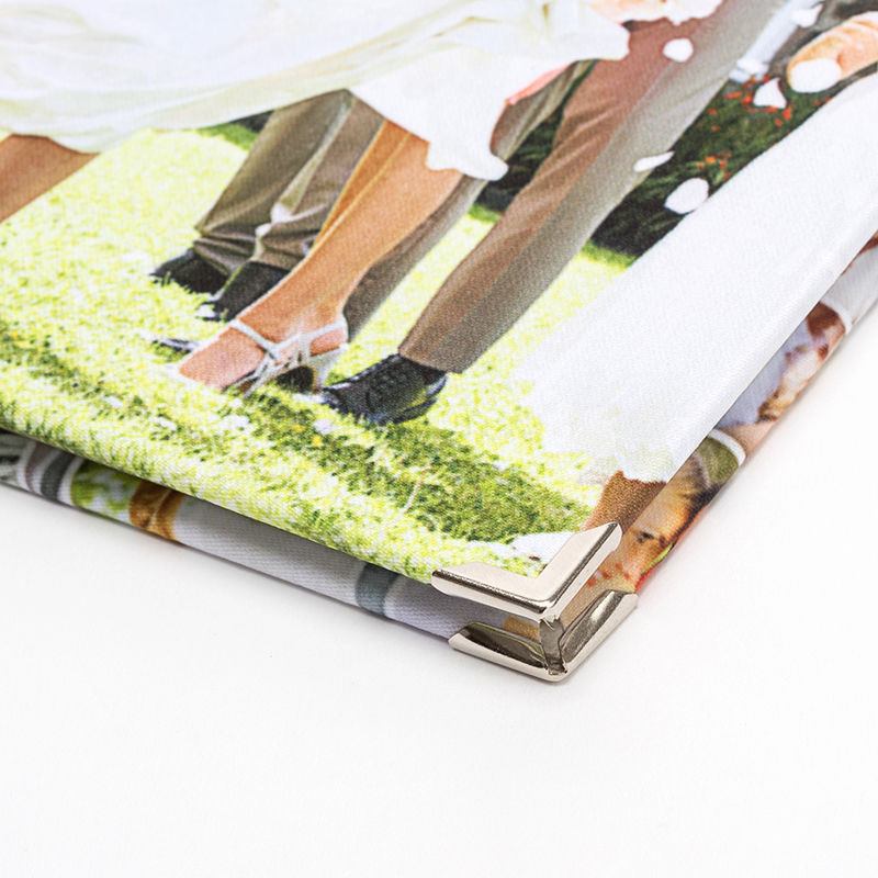 Il libro degli ospiti personalizzati è realizzato con una copertina rigida in raso Monroe, stampata su entrambi i lati con le tue foto. Questo tessuto conferisce al guestbook una finitura di classe e di alta qualità, che colpisce immediatamente i tuoi ospiti. Usiamo un processo di stampa innovativo che fonde l'inchiostro in profondità nelle fibre di raso, assicurando che i tuoi progetti siano di lunga durata e non si spezzino o si sfaldino. Il raso Monroe possiede una trama naturale e visibile attraverso la stampa, esaltando il fascino autentico del tuo libro degli ospiti personalizzato. Il dorso è disponibile in sei colori; nero, blu, verde, rosso, rosa o grigio e le pagine possono essere con griglia o lasciate vuote. Rifiniamo il libro con eleganti angoli in metallo per quel tocco finale.