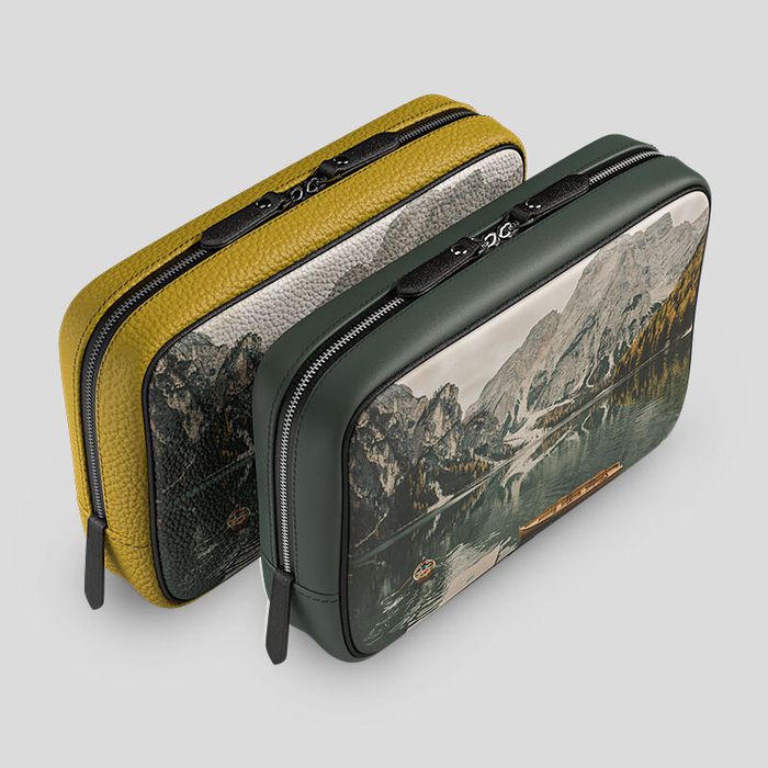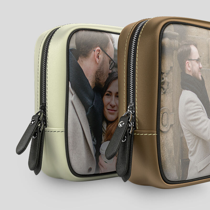 Per creare il tuo necessaire da viaggio personalizzato, disponi di ben cinque aree da disegnare: la parte anteriore, posteriore, base e due pannelli stretti. Il pannello anteriore e quello posteriore rappresentano fantastiche tele per foto o immagini di paesaggi. Gli altri tre pannelli sono sottili e lunghi, quindi colori unici o motivi che si abbinano alla tua foto sono perfette per riempire queste aree. Puoi anche aggiungere del testo o giocare con i nostri strumenti per facce e nomi, e creare la borsa toilette con foto perfetta.
