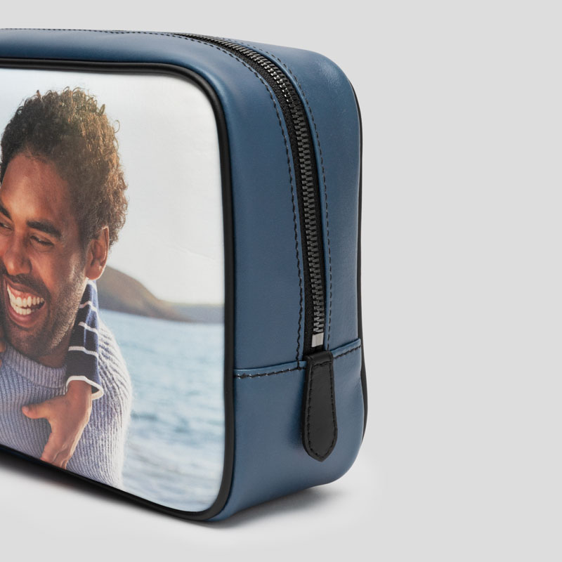 Ogni parte della borsa toilette con foto viene realizzata per essere funzionale in modo da sembrare fantastica nel tuo bagno e anche fuori casa. La pelle utilizzata è di ottima qualità e con il passare del tempo acquisisce ancora più bellezza. Per le cuciture, viene utilizzato un filo del colore a tua scelta, tra crema, grigio o carbone. Gli inserti del necessaire da viaggio personalizzato sono sempre fatti in pelle di nappa liscia nera, inclusi i tiretti delle zip e le linguette laterali.