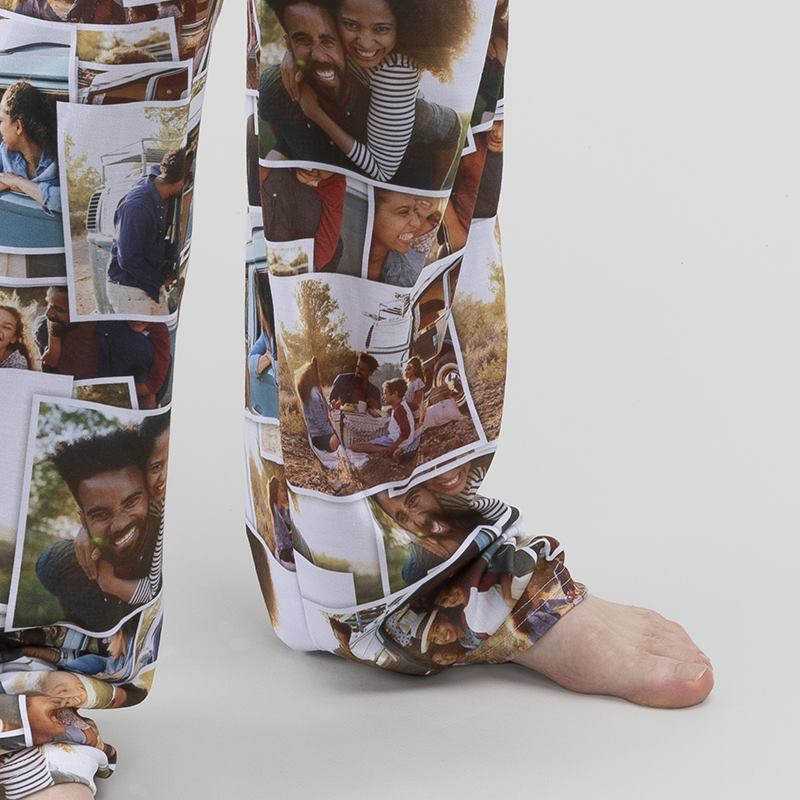 I pantaloni sono lunghi e dotati di una patta frontale e di pratiche tasche laterali. Puoi scegliere il colore delle rifiniture, personalizzare le gambe con foto, testi o disegni, e persino aggiungere un’etichetta se desideri un pigiama personalizzato con iniziali o nome. Il risultato sarà un capo unico che rispecchia il tuo stile.