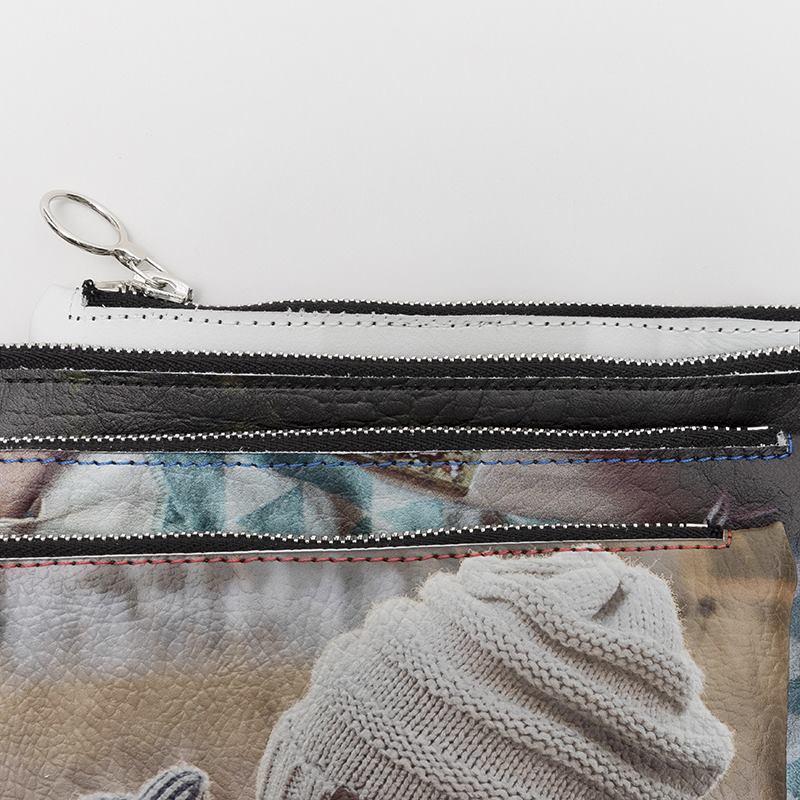 Dopo la stampa, il materiale viene quindi tagliato su misura secondo la forma scelta, in base al modello creato dal nostro esperto designer. I nostri sarti qualificati cuciono il tutto e rifiniscono la pochette con il colore del filo scelto (carbone, crema, rosso o blu), completandola con una cerniera lampo con tiretto tondo.