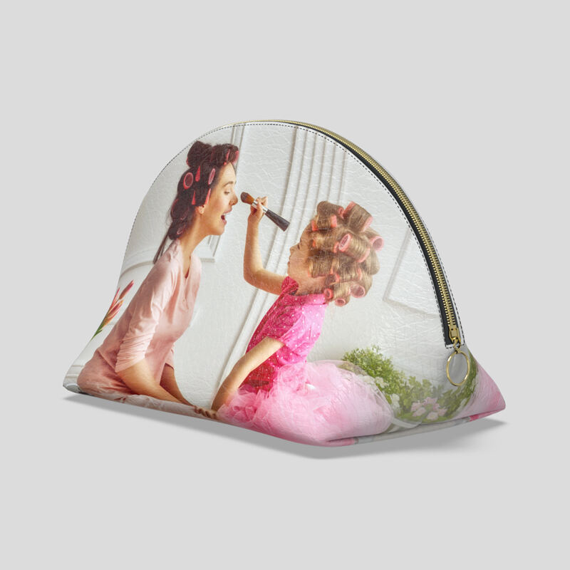 Non riesci a scegliere un'unica immagine? Caricane diverse e crea un collage d'effetto. La forma a conchiglia permette al beauty case con iniziali di rimanere in piedi da solo, così trovare i cosmetici è facilissimo. Gioca con i colori, sperimenta diversi pattern e guarda l'anteprima in tempo reale finché non sei soddisfatto.