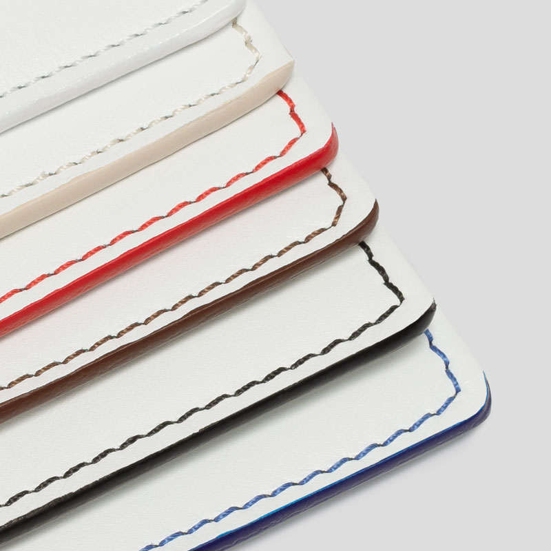 Trai due strati di materiale viene inserita una piccola imbottitura per creare un effetto morbido e spugnoso, e sulla parte superiore dei portachiavi cuore personalizzati aggiungiamo un anello metallico. Per rifinire il portachiavi, dipingiamo con cura i suoi bordi esattamente del colore del filo della cucitura da te scelto. Oltre a rifinire il prodotto, i bordi dipinti aiutano a proteggere la pelle.