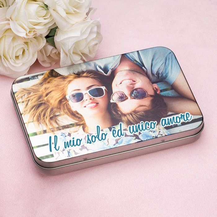 Una scatola di latta personalizzata può essere utilizzata per molte cose. Essendo in metallo, può essere usata come regalo di anniversario, e magari per il decimo anniversario di matrimonio, conosciuto come anniversario di latta. Nel caso sia un regalo per qualcuno che ami, per una scatola in latta personalizzata al meglio, scegli un soggetto adatto all'uso della scatola o all'occasione. Potrai stampare primi piani, foto di gruppo e ritratti di famiglia, gli scatti divertenti del tuo bambino mentre gioca o un paesaggio da sogno e completare la tua opera con un nome, una data, una frase o un augurio.