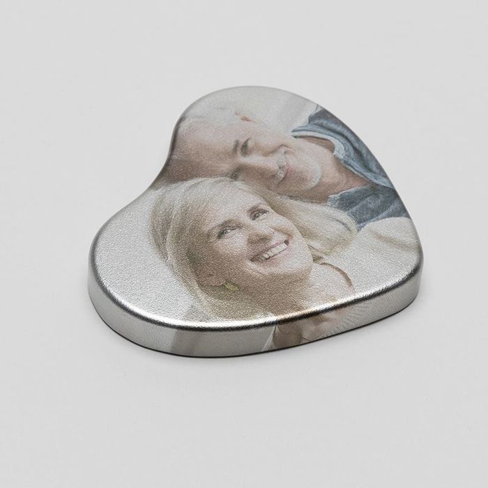Puoi anche utilizzare più immagini per creare un collage di foto. Con il nostro fotomontaggio a forma di cuore preimpostato, le tue foto possono essere disposte a forma di cuore sul coperchio antiruggine della scatola di latta. Puoi anche scegliere un colore o una delle tue foto da utilizzare come fondo.
