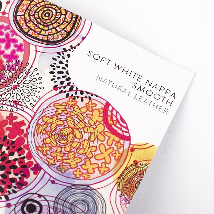 La pelle ha un colore base bianco che permette di stampare qualsiasi design in qualsiasi colore e di ottenere un risultato eccellente. I colori sono vividi e ricchi e i dettagli sono così fini che è possibile stampare testo e una linea di 2pt senza che questa venga in nessun modo distorta o diffusa sulla superficie. La pelle può anche venire piegata per essere lavorata senza che si verifichi alcuna crepa o danno - chiaramente dipendendo anche dal tipo di pelle, quelle più rigide saranno più soggette a possibili increspature in caso di forte pressione in fase di piega - e la superficie rimarrà perfettamente liscia. I colori vengono stampati direttamente sulla pelle grazie a tecniche di ultima generazione. La texture della pelle stampata non determina alcuna imperfezione e la stampa rimane precisissima anche su grammature più pesanti.