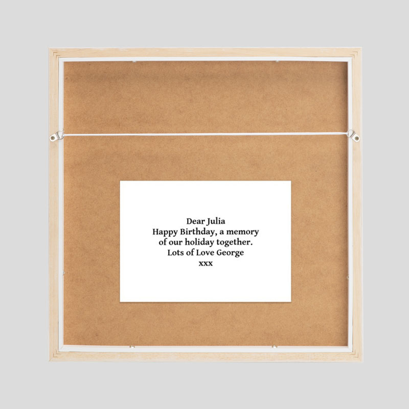 Se desideri inserire un messaggio sul retro del poster su tessuto personalizzato, hai due opzioni a disposizione. Un'opzione ti permette di aggiungere un adesivo matte formato A5. Un'altra opzione è una cartolina rimovibile formato A5, che viene inserita in una busta in Perspex attaccata sul retro della cornice, e la cartolina può scorrere dentro e fuori. Entrambe le opzioni offrono una completa personalizzazione, ideale se desideri lasciare un dolce messaggio alla persona amata.