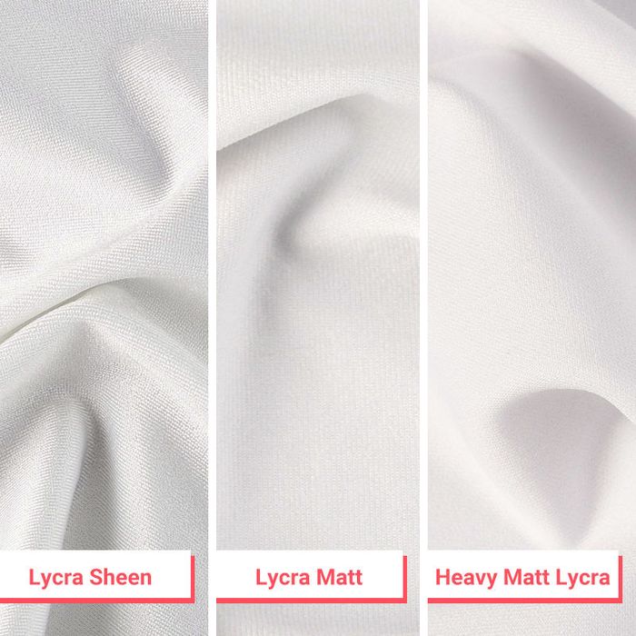 Lycra spessa ed elastica, simile a quella per abbigliamento sportivo e a compressione. Adatta per abbigliamento sportivo.