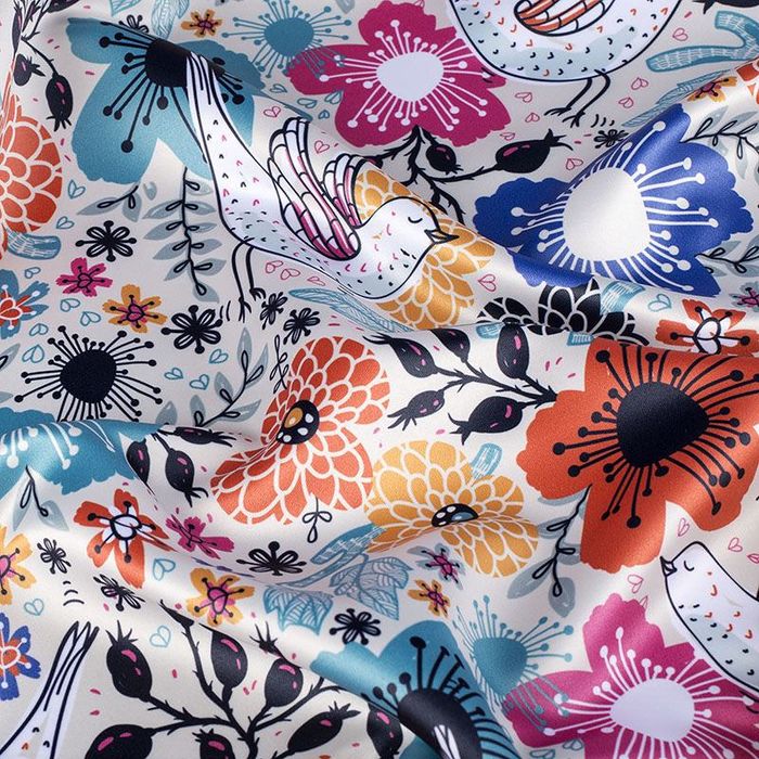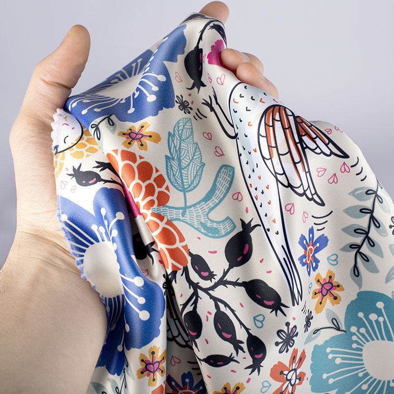 Vero raso di seta 50gr/m² 12 Momme più leggero. Dritto lucido, tocco lussuoso, bel drappeggio. Colori tenui e forti, buon dettaglio. Usi: sciarpe e accessori leggeri, dettagli raffinati. Restringimento atteso del 5% sulla trama e del 6% sull'ordito. Colori super brillanti e neri profondi utilizzando la stampa reattiva.