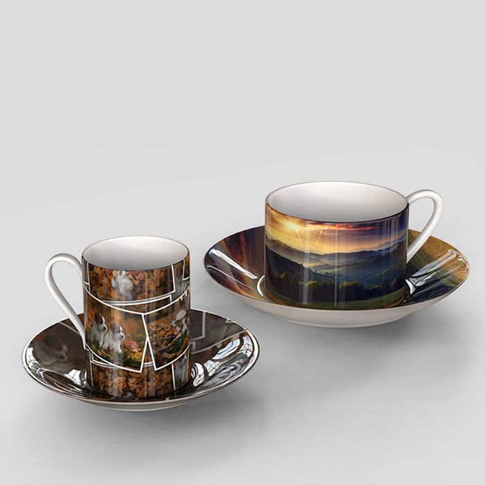 Hai due superfici da decorare: tazza e piattino. Usa un'unica immagine ad alta risoluzione per ridurre eventuali lievi scostamenti di centratura di pochi mm. Se devi creare tazzine caffè personalizzate con logo aziendale, scegli colori vivaci su sfondo chiaro per un look professionale. Per un regalo più creativo, crea un collage fotografico o inserisci nomi diversi su ogni tazzina.