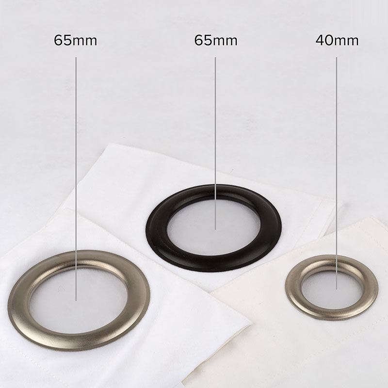Scegli se realizzare una tenda unica o due tende a sipario, e poi seleziona il tipo di aggancio. Disponiamo di risvolto da 1,5 cm di diametro per cavi di 4 mm, fettuccia arricciatenda da 7,5 cm o anelli metallici neri o argento (40 mm o 65 mm di diametro interno).